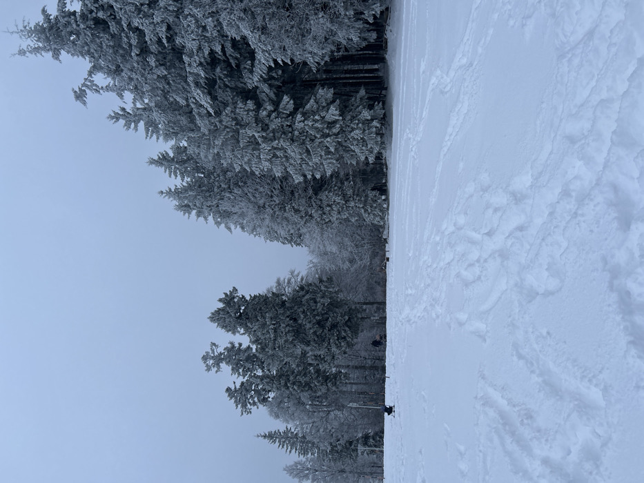 The image depicts a snowy winter landscape in Le Hohwald, France. The scene is dominated by a wide, snow-covered expanse in the foreground and midground, exhibiting numerous crisscrossing footprints and ski tracks. The sky overhead is a uniform, overcast light grey. A dense forest line, consisting primarily of evergreen trees heavily laden with snow or frost, forms the background and extends along the right side of the frame. Further back in the left-center, frosted deciduous trees are also visible. In the mid-left, a person, possibly a child, clad in dark attire, is positioned low to the ground, appearing to interact with a small sled or ski apparatus. Two additional indistinct, dark figures are visible further in the midground near the treeline. Two dark, rectangular objects, possibly benches or signs, are discernable near the treeline to the right of the center. The overall environment indicates a cold, possibly sub-freezing, outdoor setting with recent human activity.