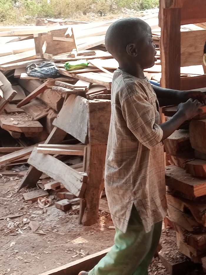 The image depicts a young individual at a sawmill or woodworking area in Ebiya, Nigeria
