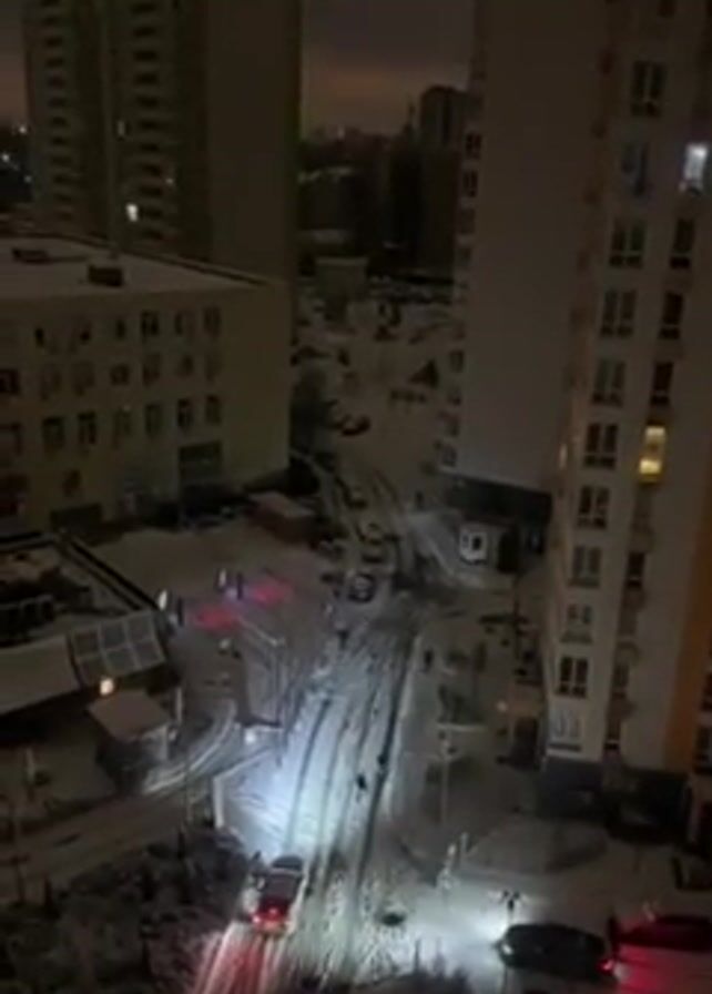 night view of a snow-covered urban area. Several apartment buildings are visible, along with a road covered in snow. Cars are parked and driving on the road. Pedestrians can be seen walking on the snowy sidewalks. The sky is dark, with faint city lights illuminating the horizon. The overall atmosphere appears cold and quiet.