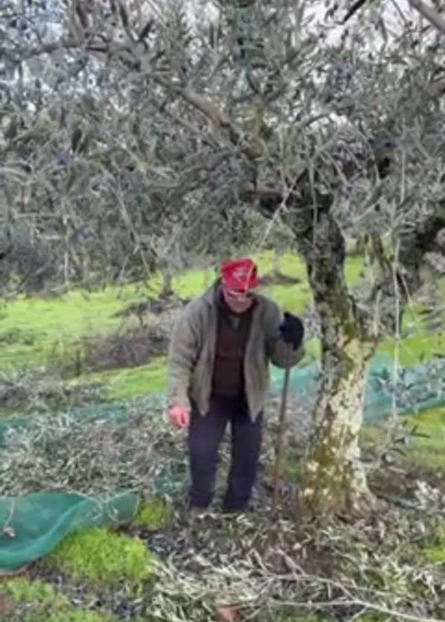 A man stands in an olive grove. He wears a red hat, sunglasses, a jacket, and dark pants. He leans on a brown stick. The ground around him is covered in olive leaves and a green net lies to his left. An olive tree laden with olives is behind him. The man looks at the camera and laughs.
