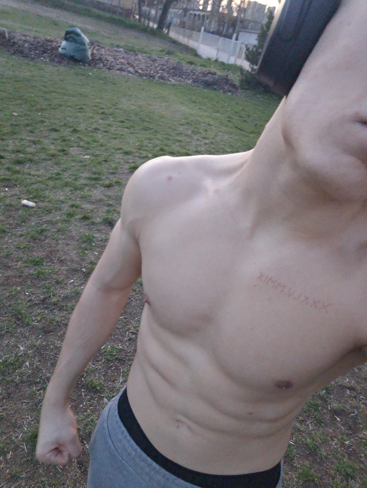 A medium-shot photograph captures the torso and upper portion of a person outdoors on a grassy area. The individual is fair-skinned, shirtless, and wearing gray sweatpants with a black waistband. A faded Roman numeral tattoo is visible on their upper chest. The background shows a green lawn, and in the distance, a tree-lined fence and a building are visible. There is a rock in the upper left. The location is Kozloduy, Bulgaria.