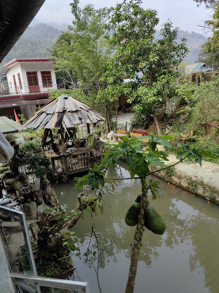 An outdoor scene in Mù Cang Chải, Vietnam, depicts a residential and natural landscape under an overcast sky. In the immediate foreground, a partial view of a window frame or railing is visible at the bottom left. A mature papaya tree with three unripe green papayas extends vertically on the right, partially overhanging a calm, murky brown-green canal that traverses the midground horizontally. On the canal's left bank, a rustic, octagonal gazebo featuring a weathered, multi-faceted wooden plank roof stands on a wooden platform adorned with various potted plants and decorative elements. To the left and slightly behind the gazebo, a two-story white building with a red corrugated metal roof and prominent red-framed windows (three upstairs, two downstairs) is visible. A small balcony is present on the second floor. A red flag is indistinctly visible near the lower section of this building. On the canal's right bank, a narrow concrete or stone pathway runs parallel to the water, where faint reddish shapes, possibly fish, are discernible beneath the surface. Abundant green foliage, including several large trees and dense undergrowth, surrounds the canal and structures. The background consists of hazy green mountains rising under a light grey sky, with distant, indistinct buildings or structures scattered among the trees. No individuals are present in the scene.