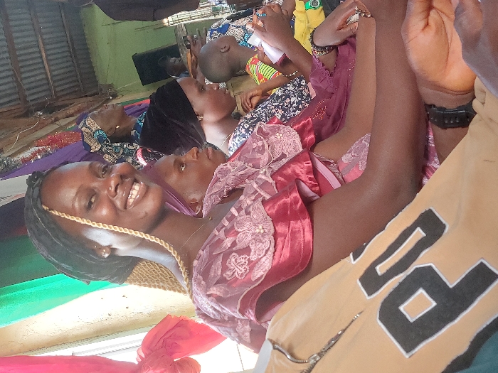 The image depicts an indoor gathering in Akwanga, Nigeria, featuring multiple individuals