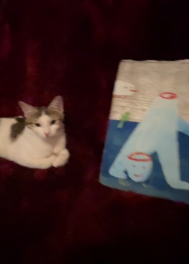 cat sitting on a dark red couch beside a painting. The cat is mostly white with grey and brown markings. The painting is on a wooden panel and depicts a stylized figure in a blue suit with its head replaced by a bucket with a smiling face. The background is divided into a grey sky area and a blue water area. There are small, cartoon-like creatures floating in the water. The couch appears to be made of a soft, velvety material. The lighting in the video is somewhat dim. The camera slowly zooms out, framing both the cat and the painting more fully.