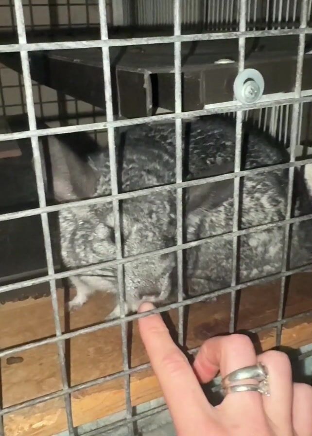 A person's hand with two silver rings is seen in the lower right of the frame. The person's index finger touches a gray chinchilla’s nose through a cage made of square metal wire. The chinchilla is resting on a wooden platform within the cage. The background of the cage contains other metal shelves and portions of the cage's structure. The lighting suggests an indoor environment, possibly at night.