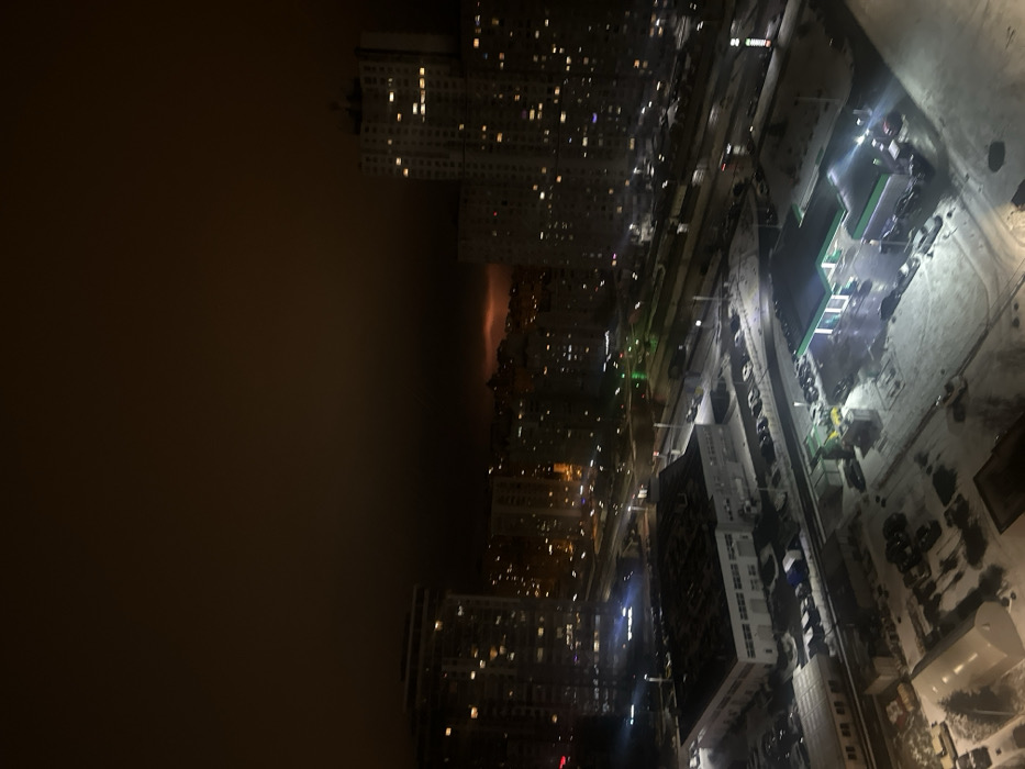 A high-angle night view reveals a cityscape partially obscured by a dark, murky haze to the left. Illuminated skyscrapers punctuate the darkness with numerous small lights. To the right, a complex of buildings and roadways glistens under streetlights, showing parked cars and snowy patches. In the center, a distant orange glow suggests a possible fire or industrial activity. The image appears rotated, positioning the horizon vertically.