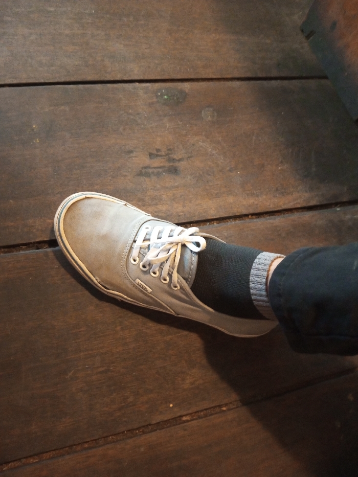 A grey Vans shoe sits on a dark wooden surface. The shoe is laced and shows a black sock with a grey striped cuff. A portion of a dark-colored pant leg is also visible. The lighting is slightly dim, highlighting the texture of the wood and the wear on the shoe. A portion of a wooden chair is visible in the upper-right corner.