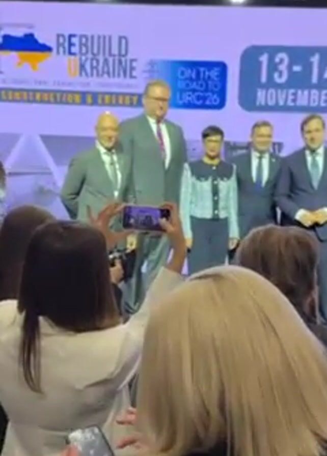 Here is a detailed description of the video: The video shows a group of people on stage at a "Rebuild Ukraine" conference. The event seems focused on construction and energy, and is happening between November 13-14, 2025. The backdrop displays a logo with the Ukrainian flag, construction imagery, and the phrase "ON THE ROAD TO URC '26". Several people are standing on the stage, including three men in suits and a woman in a patterned jacket. The person recording the video is in the audience and using a smartphone to take a photo of the people on stage. Other audience members are visible, with the backs of their heads prominent in the foreground.