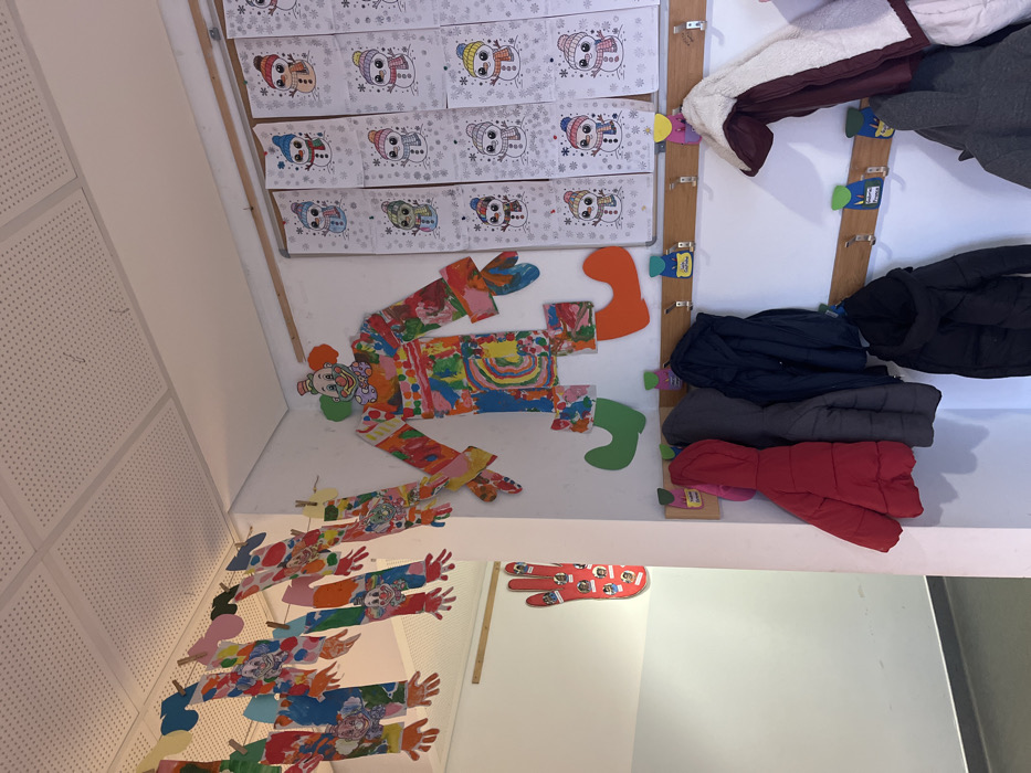 A classroom wall features children's artwork: a collage of a clown figure with colorful patches, a row of snowman drawings, and dangling clown cutouts with painted hands