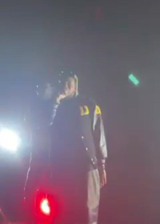 Sure, here is a description of the video: The video shows a man singing onstage at a concert. The man is wearing a black jacket with a yellow letter on it, grey pants, and sneakers. He is holding a microphone and rapping. There are other people standing beside him. Lights flash on the stage. The overall visibility is very dark. The floor appears to be a stage. The man is performing for an audience.
