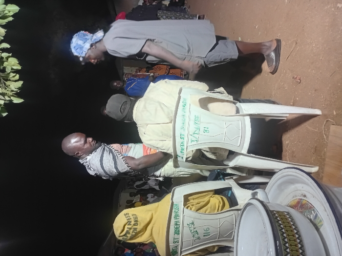 An outdoor gathering at night shows several people. One man stands wearing a grey shirt and a blue and white head covering. Two men sit on white plastic chairs. One seated man wears a light-colored shirt and a cap. The other has a striped shirt. A stack of white plates is in the foreground. The chairs have inscriptions on them. Other people are visible in the background, some wearing hats. A tree branch is on the left. The ground appears to be dirt.