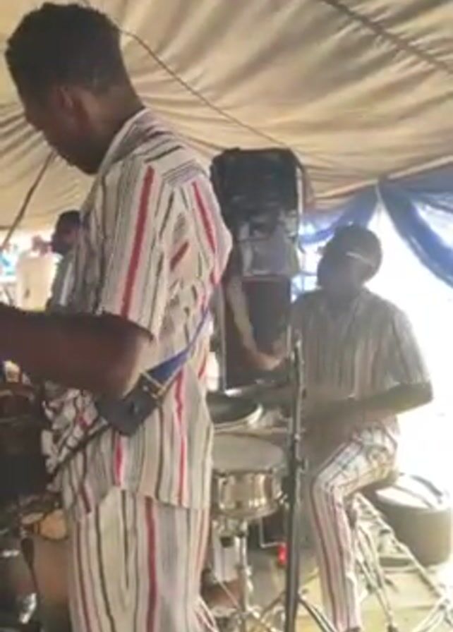 Inside a large tent, two musicians play drums. They are both wearing matching striped suits. One is seated behind a drum kit while the other stands closer to the camera and plays a drum machine. A speaker stands near the drummer. The tent is open in the background, and people dressed in white can be seen.