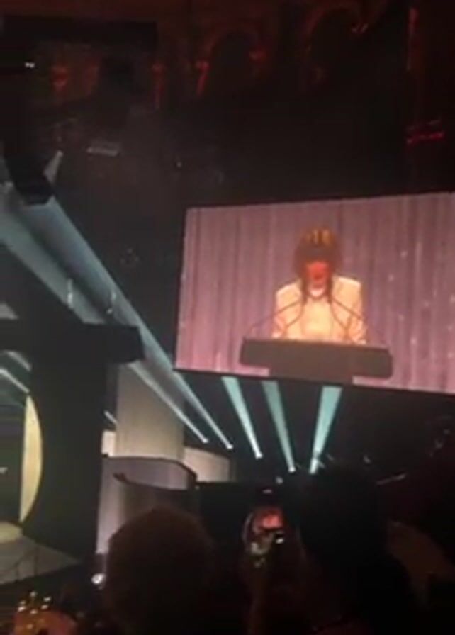 woman giving a speech on stage at an awards ceremony. A large screen displays a close-up of the woman, while on stage she stands behind a podium with a microphone. The stage is decorated with a large, abstract set design featuring a black and white circle. The audience is visible in the foreground, with people holding up their phones to record the event. The lighting is dramatic, with spotlights shining on the stage and the speaker.