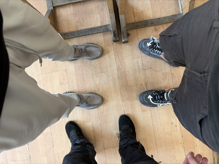 The image presents a high-angle, top-down view of the lower extremities of three individuals standing on a light brown wooden floor. At the top-center, one person wears light grey sweatpants and grey Adidas Yeezy Boost 350 V2 sneakers. To the left, another individual wears dark, potentially distressed, jeans and black sneakers, consistent with Nike Air Jordan 4 Black Cat. In the foreground, a third person, from whose perspective the image is captured, wears dark grey cargo pants and black/grey sneakers featuring a prominent white arrow logo, indicative of Off-White branding. All three subjects are standing in close proximity, with their feet oriented towards a central point, suggesting a casual stationary gathering or interaction. The wooden floor exhibits visible grain and minor surface wear. A section of a worn wooden frame or support structure is visible along the right edge of the frame. The scene is indoors, but no specific architectural or environmental details are present to identify a precise location within the city of Sofia, Bulgaria.