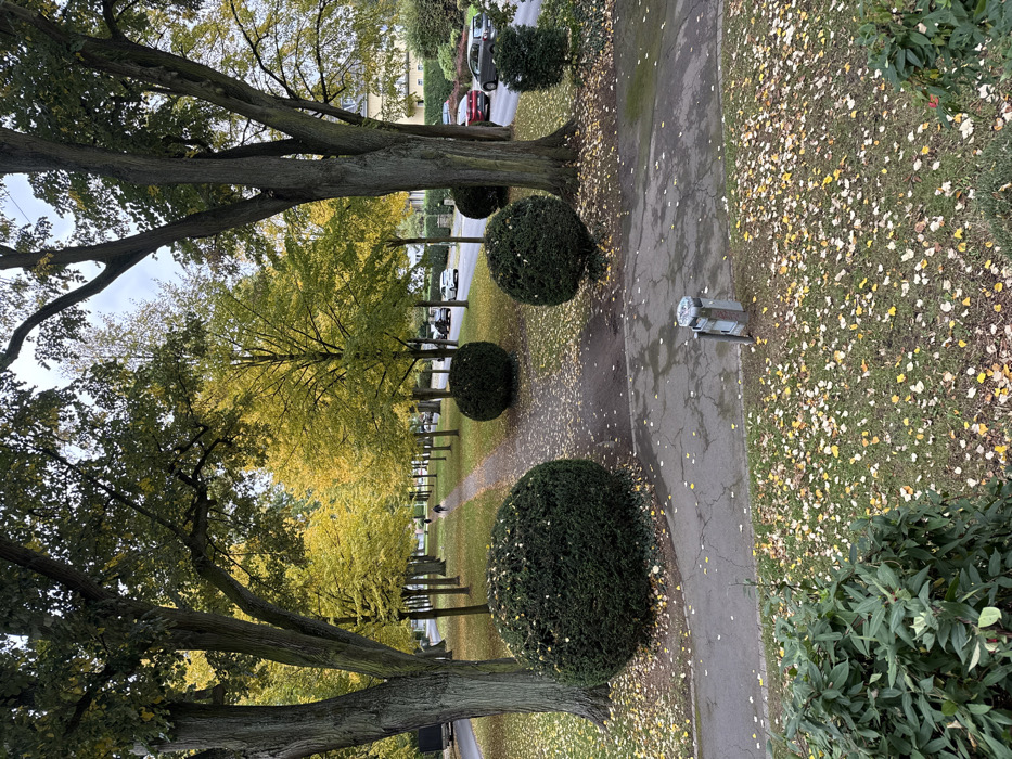 The image depicts an autumnal street scene in Dortmund, Germany. A central unpaved path, covered in scattered yellow and brown leaves, recedes into the distance, flanked by rows of mature deciduous trees with predominantly yellow and some green foliage. One individual, dressed in dark clothing, is observed walking away from the viewer on this central path in the midground. Two large, spherical dark green topiary shrubs are prominently positioned in the foreground and midground, adjacent to the path. Paved roadways run parallel on both the left and right sides of the central green space. The left road features a dark-colored commercial vehicle (possibly a truck or van) parked in the distance. The right road contains several parked passenger cars, including red, silver, and white vehicles. Residential buildings, partially obscured by trees, are visible in the background on the right. The immediate foreground includes a cracked grey paved surface with fallen leaves and a dense green shrub. A grey, rectangular metal fixture or bollard is visible on the paved surface in the lower right. The sky is overcast, providing soft, diffused lighting across the scene.