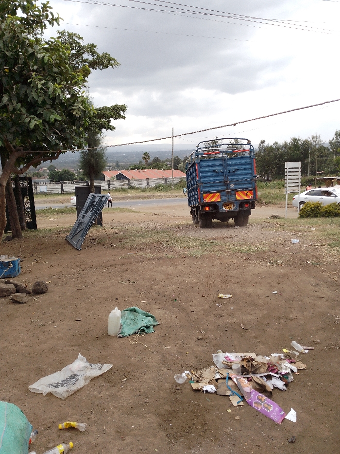 The image captures an outdoor scene in the city of London ward, Kenya, under an overcast sky. The foreground consists of an unpaved, reddish-brown dirt surface, scattered with refuse. Specific items include a transparent plastic bag, two yellow-capped plastic bottles, a white plastic jug, and a folded green cloth. To the right, a pile of mixed trash, including cardboard, plastic wrappers, and other discarded materials, is present. On the far left, at the base of a multi-stemmed tree with green foliage, are several dark rocks and a blue plastic crate. A dark, ornate metal gate or panel is leaning vertically near the tree. In the mid-ground, a paved road extends horizontally. A blue truck, equipped with a metal caged cargo bed and red and yellow reflective markings, is visible from the rear, facing away from the viewer. The license plate "KCY 916K" is partially legible. To the right of the truck, a white sedan is partially visible near a multi-slatted white signpost. A single individual, dressed in a white shirt and dark trousers, is observed walking on the far side of the road. The background features several low-rise buildings with orange-tiled roofs and white perimeter walls, one displaying a partial sign "RIO ESTATE." Beyond these structures, a line of green trees and distant hazy hills are visible under the cloudy sky. Multiple overhead power lines or cables are present across the upper portion of the frame.