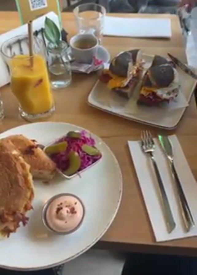 table at a restaurant. On the table are two plates of food. One plate has what appears to be two grilled sandwiches, a small bowl of purple cabbage with pickles, and a small bowl of a pinkish sauce with seasoning on top. The second plate has two sandwiches on a bagel with cheese and what seems to be bacon. There is also a glass of orange juice, a glass of water, and a cup of coffee. A person appears to be cutting the sandwiches on the bagel with a fork and knife.