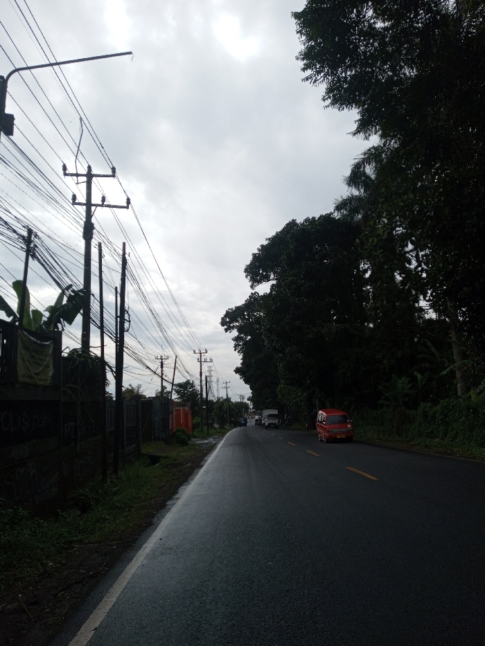 The image presents an overcast street scene in the city of Kamji Na-Yekha, Bhutan. A two-lane asphalt road, appearing wet from recent precipitation, recedes into the distance. It features a solid white line marking the left shoulder and solid double yellow lines separating the lanes. The sky above is uniformly grey and cloudy. On the left side of the road, numerous utility poles are visible, supporting a very dense network of black overhead power and communication lines. The tallest pole includes a street light fixture extending over the road. Below the utility lines, a dark fence or wall, marked with white graffiti, runs parallel to the road. Green foliage, including large banana-like leaves, is situated near this fence, with a light-colored sack or fabric draped over it. The right side of the road is bordered by dense, dark green trees and thick vegetation. A red compact van or mini-bus is visible in the right lane, facing away from the camera, with its rear prominently displayed. Further down the road, several additional vehicles, appearing light-colored (possibly white trucks or vans), are visible in the distance. No individuals are discernible within the frame.