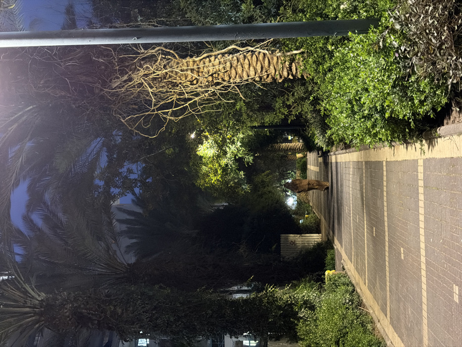 The image depicts a nighttime scene on a paved pedestrian pathway in Kiryat Motzkin, Israel