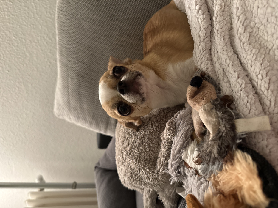 A tan and white Chihuahua peers up at the camera with large, round eyes. The small dog is nestled among plush blankets and several stuffed animals, including a squirrel and another brown dog. A gray pillow is visible in the background. The scene evokes a sense of coziness and comfort.