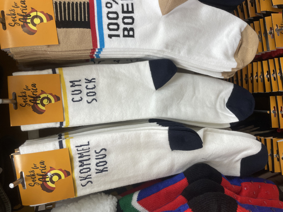 shelf of socks from "Socks for Africa." One pair reads "100% BOER" with red, white, and blue stripes. Another pair says "CUM SOCK" in bold black lettering with a yellow stripe. A third pair features the text "SKOMMEL KOUS" also in black letters and accompanied by a yellow stripe. The socks are primarily white with colored toes.