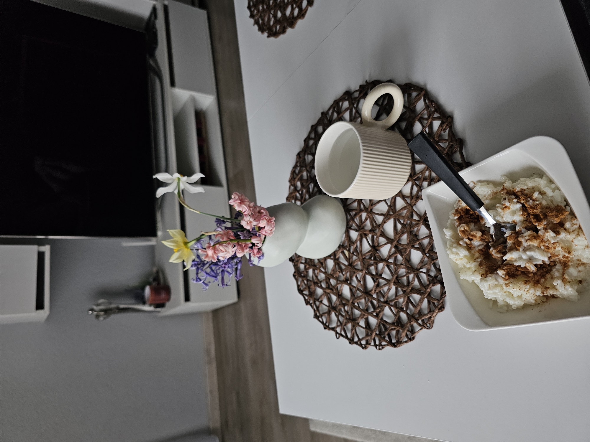table setting indoors. On a white table, there is a brown woven placemat, a white mug with a round handle, a white vase with flowers (narcissus, hyacinth, and others), and a white square bowl filled with rice pudding topped with cinnamon. A spoon with a black handle rests in the rice pudding. The scene is shot from above and slightly angled. In the background to the left, there is a television set and shelves. The precise location in Plovdiv, Bulgaria cannot be determined from this image.