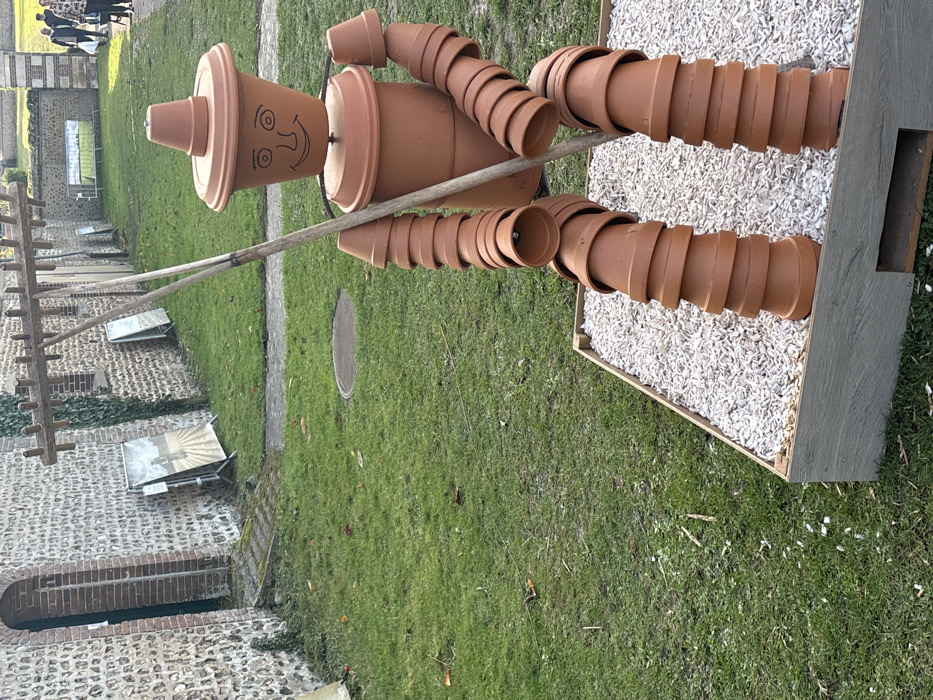 The image displays an outdoor scene in Mesnils-sur-Iton, France, under natural daylight. A humanoid garden figure, constructed from terracotta flowerpots, stands centrally within a square planter box. The planter box, appearing to be assembled from light grey wood or a repurposed pallet, contains small, light-colored pebbles. The figure's head is a wide terracotta pot with a smiling face drawn in black marker, featuring eyes, eyebrows, and a nose, topped by an inverted smaller terracotta pot. Its torso is a larger cylindrical pot, and its limbs are formed from stacks of smaller terracotta pots. A wooden garden rake, with a long handle and a horizontal head comprising multiple tines, leans against the figure's right side. The figure is situated on green grass, which shows scattered debris. In the background, a light-colored path winds past a rough-hewn stone wall featuring a brick archway. Two framed artworks are propped against this wall on the grass. In the far background, several indistinct human figures are visible walking near a large, ornate stone building.
