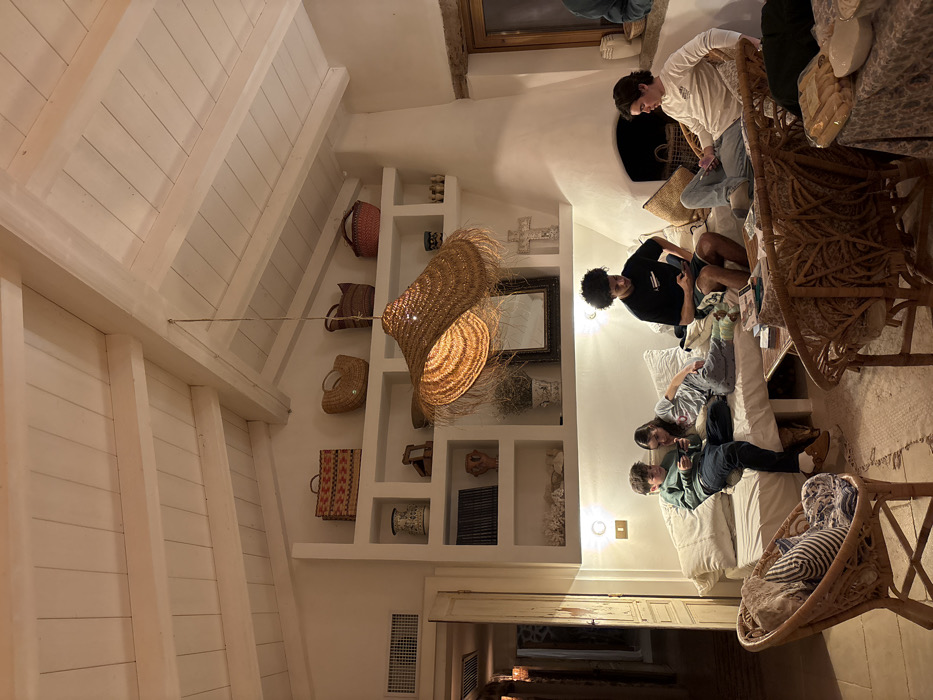 A cozy interior scene depicts four individuals relaxing on a cushioned sofa. Two are seated in ornate wicker chairs nearby. A unique straw chandelier hangs from the beamed ceiling, partially obscuring a built-in shelving unit filled with baskets and decorative items. A mirror adorns the wall above the sofa, and the scene is illuminated by wall sconces. Below, a glimpse of an adjacent room with candlelit ambiance is visible.