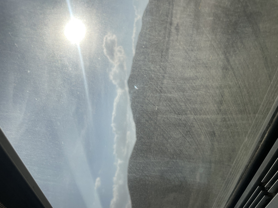 The image appears to be a view through a dirty sunroof or window. Sunlight shines brightly through the glass, with clouds partially visible. A stark contrast exists between the clear, sunlit portion and a grimy, opaque area covered in streaks and smudges. Window vents appear on the right side of the image. The composition is off-center, highlighting the division between clean and dirty surfaces.