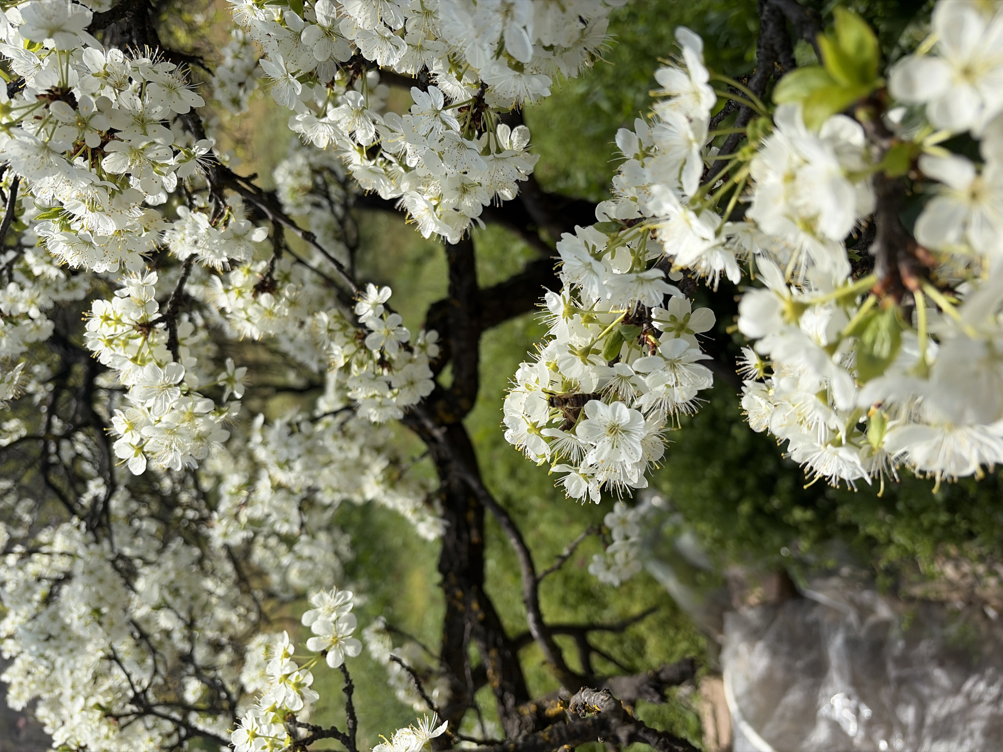 A close-up, slightly angled view showcases a flowering tree with a dense canopy of white blossoms