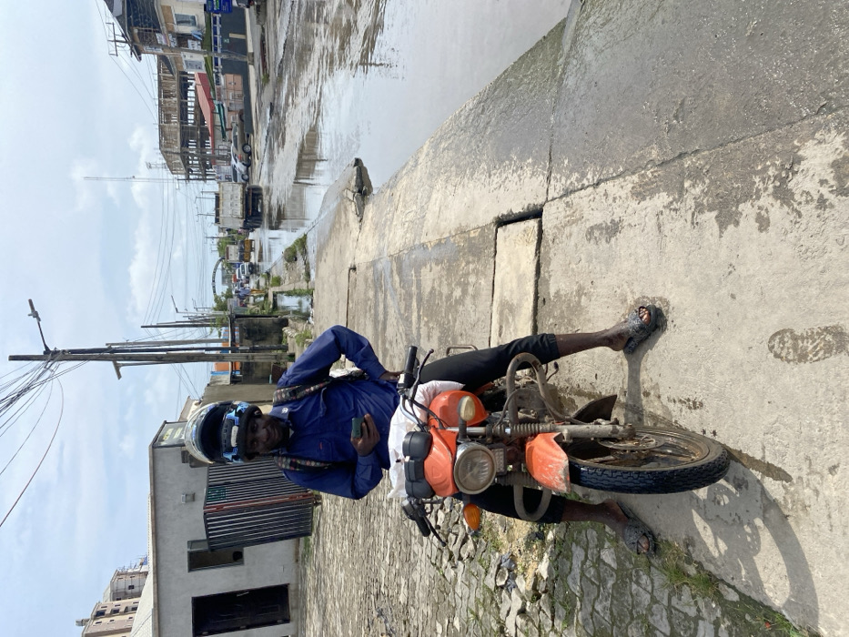 The scene is an outdoor street view in Ikate, Nigeria, under a partially cloudy sky. In the foreground, a dark-skinned male individual is seated astride a dirty, orange motorcycle, facing the camera. He wears a dark blue long-sleeved shirt, dark trousers cropped above the ankles, and dark patterned slide sandals. A dark backpack is visible on his shoulders. He wears a dark blue and white full-face helmet with the visor raised. His left hand holds a dark-colored smartphone, while his right hand rests on his hip. The motorcycle is equipped with a circular headlight, smaller rectangular light below it, orange turn signals, and front crash bars. A white bundle or bag is secured to the handlebars. To the subject's left, a light-colored building with a dark door and window frames stands on a paved surface. Behind it, a multi-story building under construction is visible in the distance. Utility poles with numerous overhead electrical and communication wires are prominent throughout the image. To the subject's right, a concrete sidewalk, partially wet and dirty, separates the foreground from a significantly waterlogged paved road. The road is inundated with standing water, reflecting the sky. Along the left edge of the road (from the road's perspective), an open drainage ditch with stagnant water is visible. Vehicles, including a white dump truck, smaller cars, and a yellow three-wheeled vehicle, are present further down the road. Another multi-story structure, also appearing to be under construction, is located on the right side of the road in the mid-distance. Streetlights are mounted on some of the utility poles.
