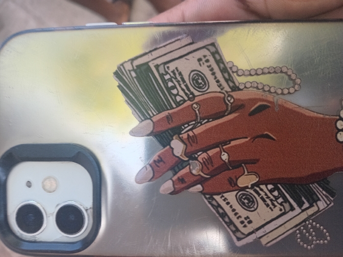 An iPhone with a metallic silver phone case. The case is decorated with a graphic of a dark brown hand holding a stack of American dollar bills, adorned with several rings and a pearl necklace. The camera lens and flash are visible, positioned inside a black square frame. The case exhibits signs of wear and tear, with visible scratches on the metallic surface.