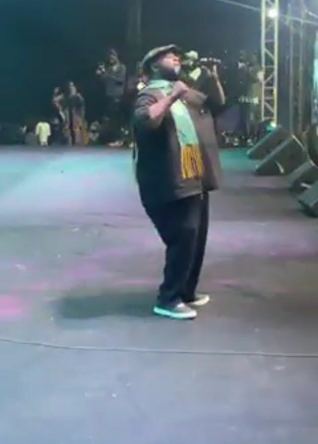 A man sings into a microphone on stage. He wears a black shirt, black pants, a green and yellow scarf, and a hat. He dances a bit while he sings. In front of the stage, a woman in a puffy jacket dances, and some other people are visible near the back of the stage. There are many lights visible, and large speakers on the side of the stage.