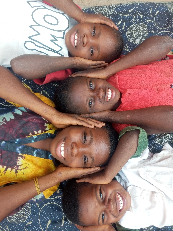 - "Four children lie in a row on a patterned blanket, heads touching, smiling directly at the camera" by FM-l9iEo2, licensed under CC BY 4.0