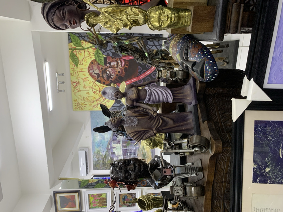 The scene depicts an interior view of an art gallery or shop in Ikate, Nigeria, showcasing a diverse collection of sculptures and paintings