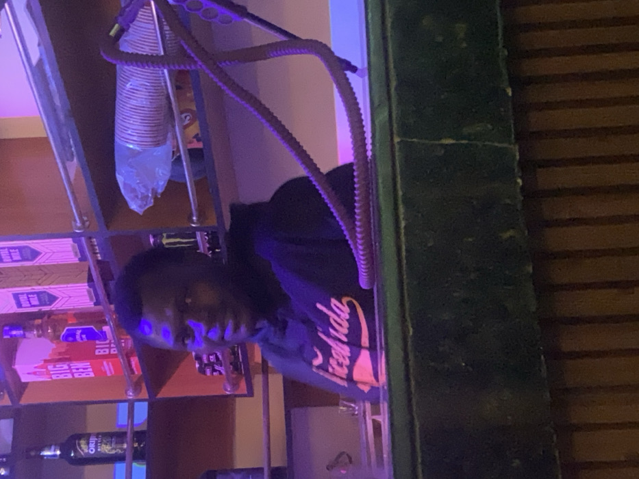 A male individual with dark skin and short dark hair is partially visible behind a dark green counter in a bar or lounge setting located in Jos, Nigeria. He is wearing a dark hoodie with a light-colored, stylized text logo on the chest and exhibits a slight smile while looking towards the viewer's left. Behind him, a shelving unit features various bottles and items under ambient purple and orange lighting. On the upper left shelf, a dark bottle labeled "ORIJIN BITTER" is visible. To its right, boxes labeled "BIG BEN" and "ROYAL MILE" are present, along with other liquor bottles. On a lower shelf, a dark can with a green "M" logo (Monster Energy) is identifiable, alongside a plastic-wrapped stack of light-colored disposable cups. A coiled, ribbed, brownish-purple hose, consistent with a hookah hose, extends from the right side of the frame, curving across the lower right background. Below the dark green counter, a section of vertical wooden slats or panels is visible. No specific actions or interactions are depicted beyond the individual's posture and gaze.