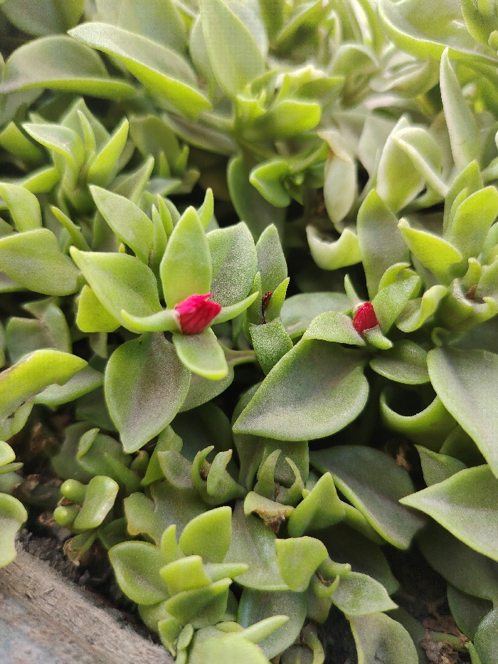 The image displays a macro view of a succulent plant, located in Trujillo, Peru. The frame is densely filled with numerous light green, ovate, fleshy leaves, each exhibiting a finely textured or slightly fuzzy surface. Two prominent, vibrant reddish-pink flower buds, each approximately 0.5 cm in diameter, are visible emerging from the foliage. The background consists entirely of additional, slightly out-of-focus foliage of the same plant. A dark, coarse linear element, consistent with the edge of a planter or exposed soil, is visible along the bottom left. No human or animal subjects are present. The scene is illuminated by ambient natural light.