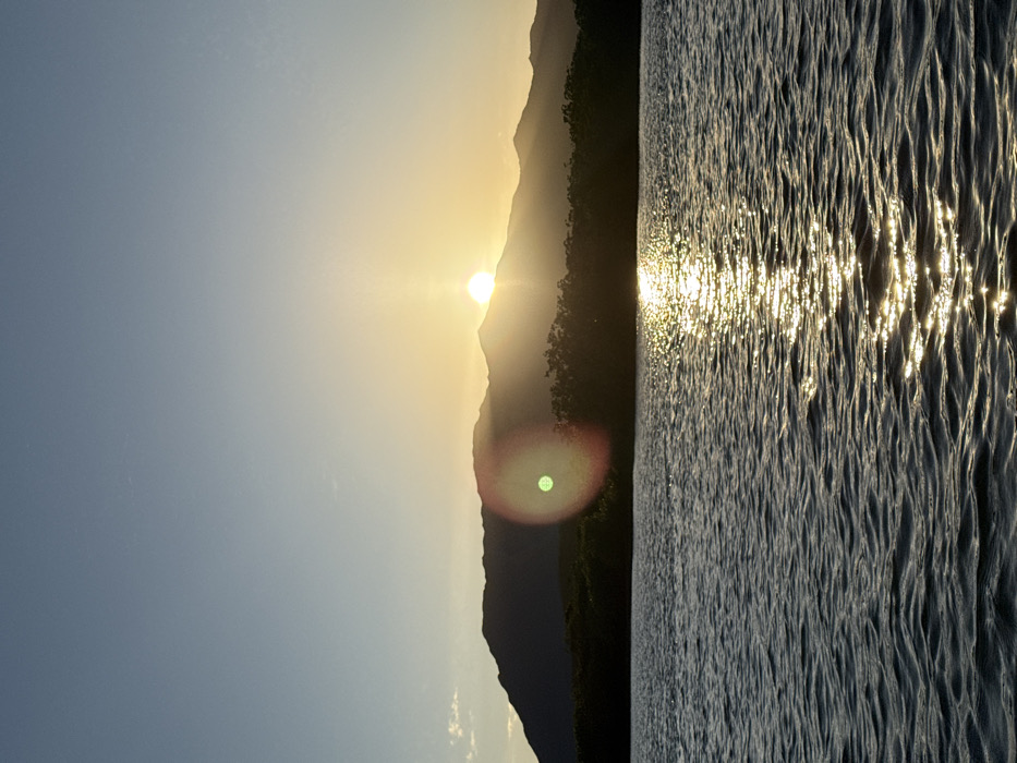 The image presents a sunset scene over a body of water in Dumbéa, France. The sun, a bright yellow disc, is positioned low on the horizon, partially obscured by the dark silhouette of undulating mountains in the background, primarily on the right side of the frame. A distinct green circular lens flare with a reddish halo is visible to the left of the sun. A dark band of dense vegetation, consistent with mangroves, forms the shoreline between the mountains and the water. The lower half of the image features calm, dark blue water with numerous ripples, reflecting the golden sunlight in a prominent, shimmering path extending from the horizon towards the foreground. The sky transitions from a clear light blue at the top to a bright yellow-orange near the sun. No individuals, man-made objects, or specific actions are discernible.
