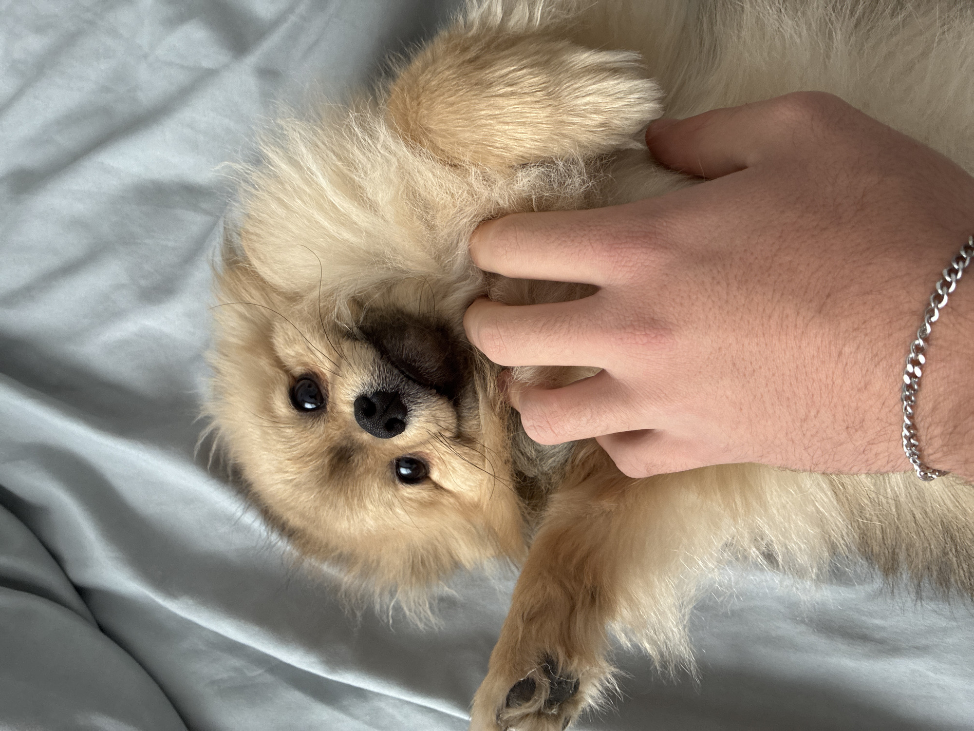 An overhead view captures a tan-colored Pomeranian dog lying on its back on light gray bedding, its head slightly tilted and eyes looking directly forward. Its mouth is slightly open, forming a subtle upturned curve. A human's right hand, bare and lightly haired, is visible in the lower right, with fingers curled, appearing to scratch or pet the dog's chest and neck area. A silver-colored chain bracelet is worn on the wrist of the human hand. One of the dog's front paws is raised slightly towards the left side of the frame. The bedding fabric exhibits soft folds and wrinkles. The specific city of Kostandovo, Bulgaria, cannot be visually identified within the image.