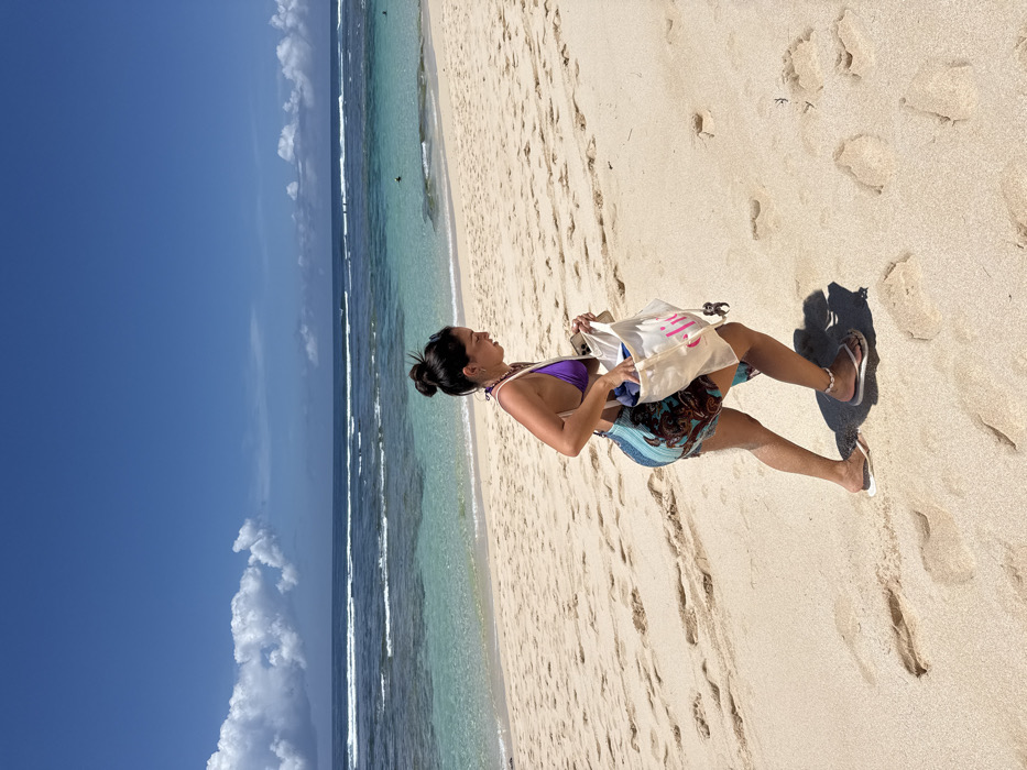 A female individual is depicted walking on a sandy beach in Ungasan, Indonesia, under a clear blue sky with scattered white clouds