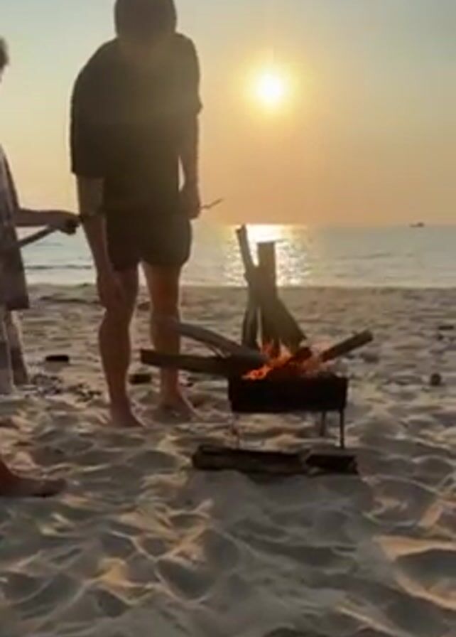 two people standing near a small fire on a sandy beach at sunset. The fire is burning inside a black metal grill, with larger pieces of wood leaning against it. One person is wearing dark clothing and shorts, standing next to the grill and tending to the fire with a stick. The other person, a child, stands to the side wearing a patterned outfit and holding a stick. The sun is setting over the ocean, creating a golden glow on the water and the beach. The camera moves slightly, focusing on the fire and the person tending to it.