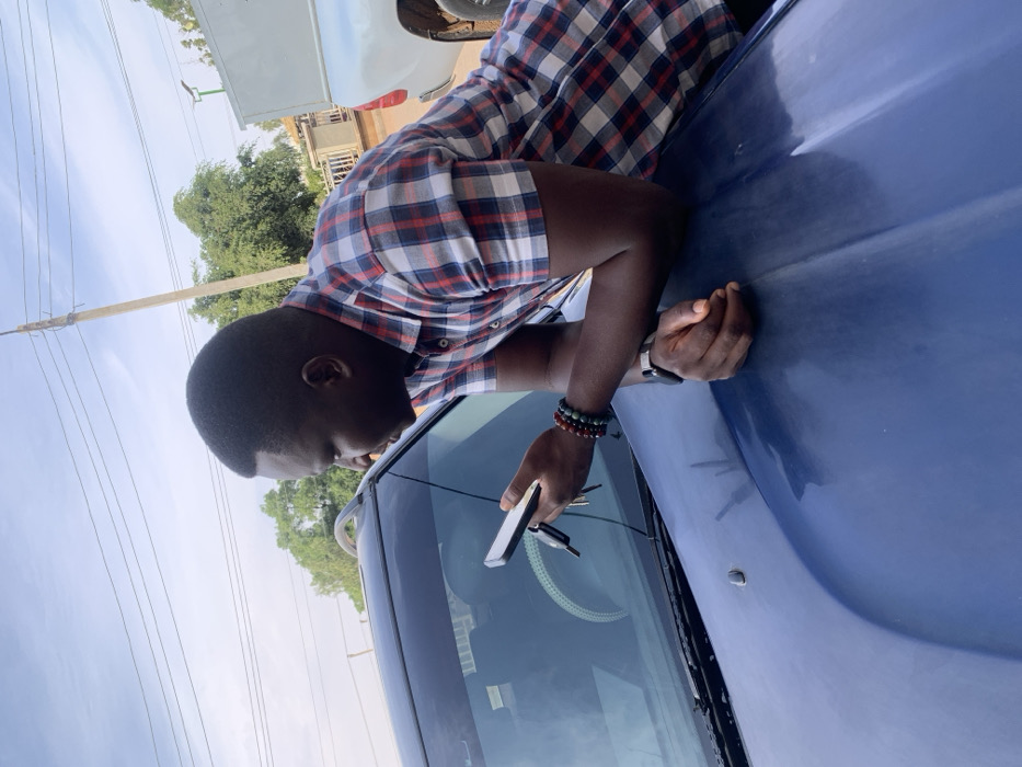 - "A man in a plaid shirt leans over the hood of a blue car, looking at his phone" by FM-rhFJW2, licensed under CC BY 4.0