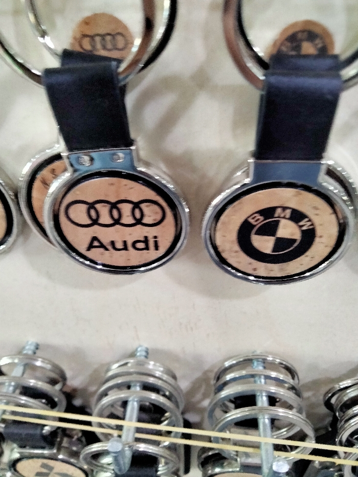 This image presents a close-up, eye-level view of retail merchandise, specifically keychains and related souvenir components, displayed against a uniform, light-colored background. The scene is situated within a retail establishment, presumably a souvenir or gift shop, in Fátima, Portugal. In the upper half of the frame, two primary keychains are prominently featured. The left keychain consists of a circular, chrome-plated metal frame, approximately 4-5 cm in diameter, which encapsulates a light brown cork insert. Etched in black onto the cork are the four interlocked rings representing the Audi logo, positioned directly above the word "Audi." This circular emblem is connected by a black, flat, synthetic strap to a metallic keyring. The right keychain exhibits an identical design, featuring a chrome-plated circular frame with a similar light brown cork insert, on which the black and white circular BMW logo is etched. This is also attached via a black strap to a metallic keyring. Partially visible keychains, including another Audi-branded item, are discernible in the blurred background. The lower half of the image displays multiple metallic cylindrical structures arranged horizontally. Each structure is composed of several stacked, thin, silver-colored metal rings assembled around a central threaded rod, which is secured by a visible hex nut at the top. A thin, pale yellow elastic band is stretched horizontally across the front of these lower metallic items.