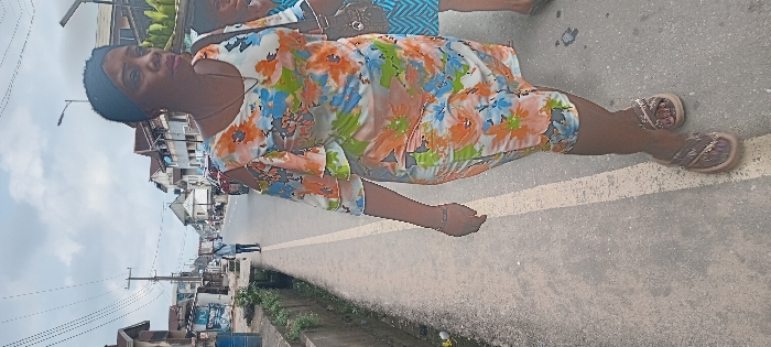 A mid-day street scene in Aba, Nigeria, depicts a woman in the foreground walking towards the viewer's right. She is of dark complexion, wearing a knee-length floral dress with a white base and patterns of orange, blue, and green flowers. The dress features cold-shoulder cutouts and ruffled sleeves. A dark headwrap covers her hair, and she wears open-toed sandals with patterned straps. A necklace with a small pendant is visible, along with a bracelet on her right wrist. Her gaze is directed slightly to her right. Partially visible to her immediate right is another individual, wearing a blue and white patterned garment, next to what appears to be a vendor's display holding green bananas or plantains. The ground consists of a paved surface with a faded white line running longitudinally. To the left of the main subject, a concrete drainage ditch is present. The street extends into the background, lined on both sides by multi-story commercial and residential buildings with varying architectural styles. Utility poles laden with numerous overhead electrical wires stand on the left side of the street. A lone male figure in light-colored attire is visible walking away from the viewer further down the street on the left. A red vehicle is partially visible on the right side of the distant road. The sky is overcast with light grey and white clouds.