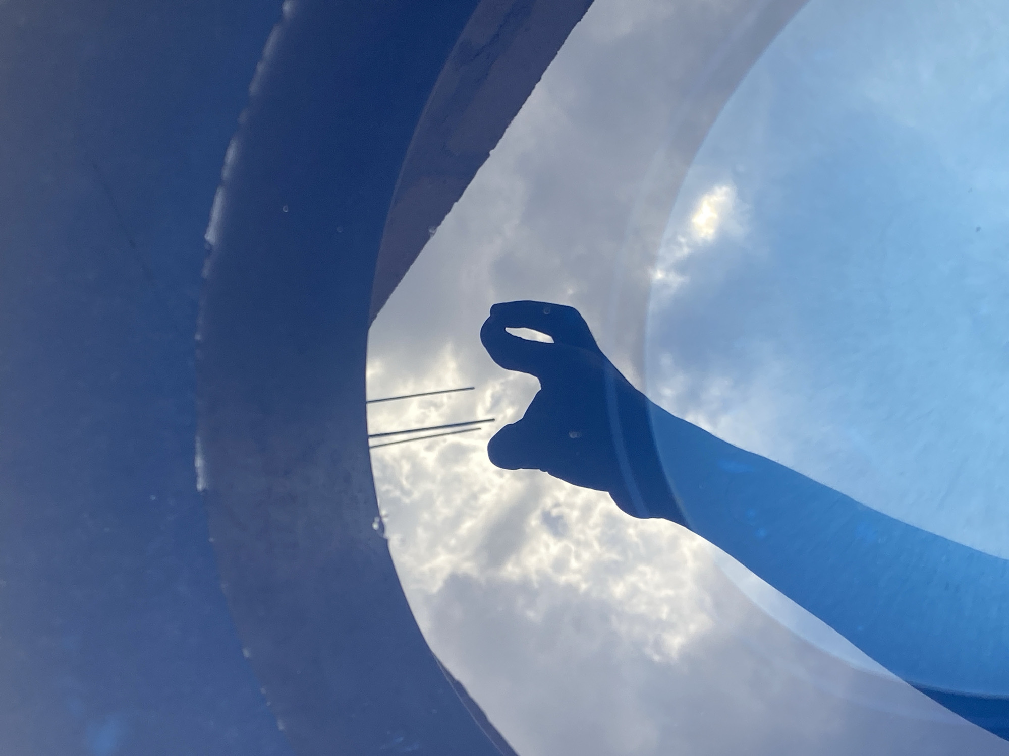 This image presents a reflection in a blue liquid, likely water, within a container, set in the city of Achara, Nigeria. The central feature is the distinct, dark silhouette of an arm and an open hand, extending diagonally from the lower left towards the upper center. The hand exhibits slightly curled fingers, clearly outlined against the reflected background. The background of the reflection displays a bright, daytime sky with scattered white clouds. Above the cloud reflections, in the upper-central portion of the image, several thin, dark, vertical linear structures are visible, consistent with poles or wires. The reflective surface is contained within a roughly semicircular boundary, with the upper portion of the container appearing as a solid dark blue. The scene is brightly illuminated by ambient light.