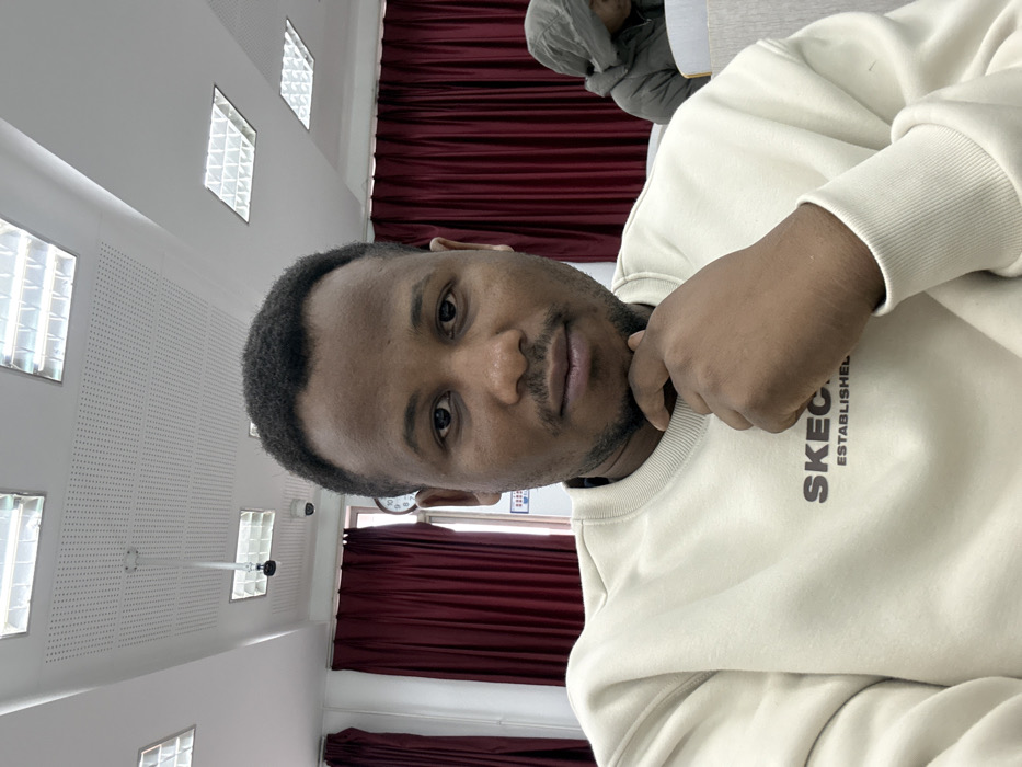 A person with dark skin and short, dark hair is looking at the camera. They are wearing a light-colored sweatshirt with the word "Skechers" on it. They have their hand near their face. Behind them, there is a maroon curtain, a person with a grey jacket, and a white ceiling with fluorescent lights. There is also a wall with white paint on the left side of the image.