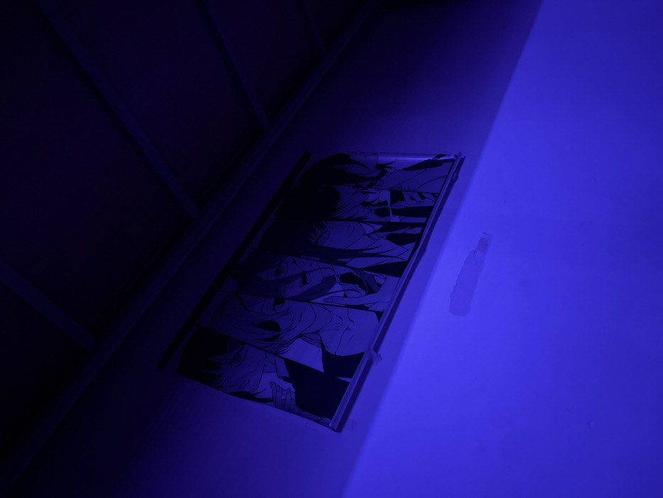 The scene depicts an interior space within Wenjiang District, China, under dim, uniform blue lighting. A rectangular poster, approximately 1 meter in width, is horizontally mounted on a light-colored wall. The poster displays a black-and-white illustration in a manga style, featuring at least five stylized human figures arranged in a linear composition. The figures exhibit distinct facial features and hairstyles, with one prominent figure wearing an eyepatch. Several figures are depicted in collared shirts and ties, suggesting formal attire. The poster is affixed to the wall by light-colored, horizontal rods or clips at its top and bottom edges. Below the poster, a section of the wall exhibits visible paint peeling or plaster damage, measuring approximately 15 cm in length and 5 cm in width, positioned to the left of the central vertical axis of the poster. The upper portion of the room, above the poster, is largely unlit, revealing dark, linear structural elements consistent with ceiling joists or beams. No individuals are physically present or engaged in action within the visible environment.