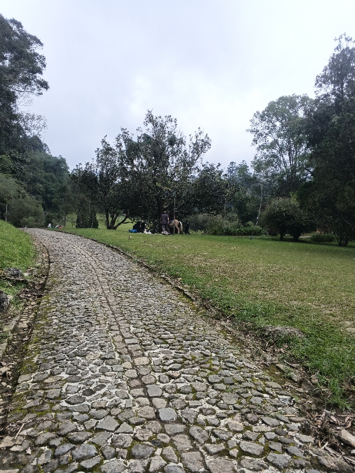 The scene depicts an outdoor park or natural area within Tây Ninh, Vietnam, under an overcast sky. A curved cobblestone path, exhibiting moss and dirt accumulation between stones, occupies the lower and left-center foreground, extending into the middle distance. Lush green grass borders the path on both sides. To the far left, a dense, dark green forested hillside ascends. In the middle ground, beneath a large, broad-canopied tree, a group consisting of three individuals and one white dog is gathered on the grass. One person stands wearing a dark top, facing a second individual in light-colored clothing who is bending over. A third person is visible seated or reclined further left within the group. A white dog is positioned near the seated individual. Additional trees and dense foliage form the background and the right side of the image.