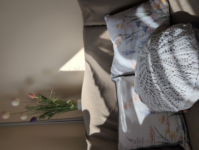 The scene depicts an interior residential space in the city of Vidin, Bulgaria. The foreground features a light brown upholstered couch, partially covered by a matching throw blanket. Three pillows are arranged on the couch. Two rectangular pillows are white with delicate floral patterns in hues of purple, blue, yellow, and pink, bordered by grey piping. A third pillow, positioned centrally and partially obscuring the others, is covered by an off-white, intricately crocheted circular lace cover. Behind the couch, on a raised surface, stands a vase containing an arrangement of five artificial flowers resembling tulips: three are pale, one is purple, and one is pink, all with prominent green stems and leaves. The background consists of a plain, light beige wall. Strong directional sunlight illuminates portions of the scene, casting sharp shadows on the back wall, including a distinct triangular pattern likely from window blinds, and shadows of the floral arrangement. No individuals are present within the frame.