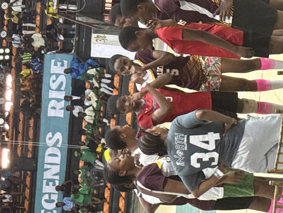 An indoor sports arena in Iganmu, Nigeria, features a group of approximately ten young females, presumably volleyball players, gathered in the foreground and midground on a light-colored court surface. One adult female, seen from the back, wears a grey t-shirt with "NORTH VOLLEYBALL 34" printed in white and light grey sweatpants, standing with hands on her hips. The other females, ranging from youth to young adults, wear athletic uniforms consisting of red tops (one with number "3") and maroon/burgundy tops (one with number "5"). One player wears colorful patterned shorts. Several players wear knee pads and bright pink and white gradient athletic socks. The group is in a huddle, with individuals looking towards each other and some gesturing with their hands. In the background, tiered bleacher seating, predominantly orange, is occupied by numerous spectators in varied attire, including green uniforms, white shirts, and a blue traditional garment. A teal banner with partially visible white text "LEGENDS RISE" spans the upper background. Overhead lighting fixtures are visible. A white vertical structure marked "3/8" is present on the right side of the frame.
